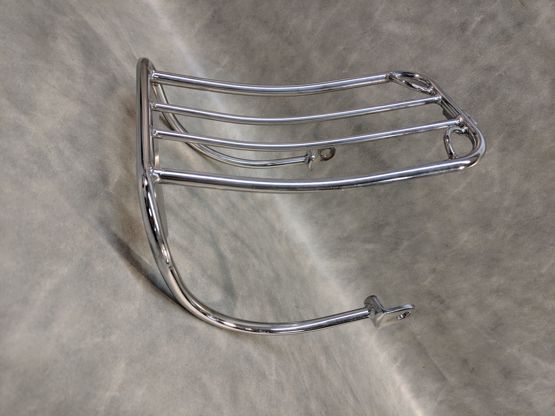 Chrome rack follows the contour of bobtail fenders. Positive attaching points for bungee straps on front loops and back panel.