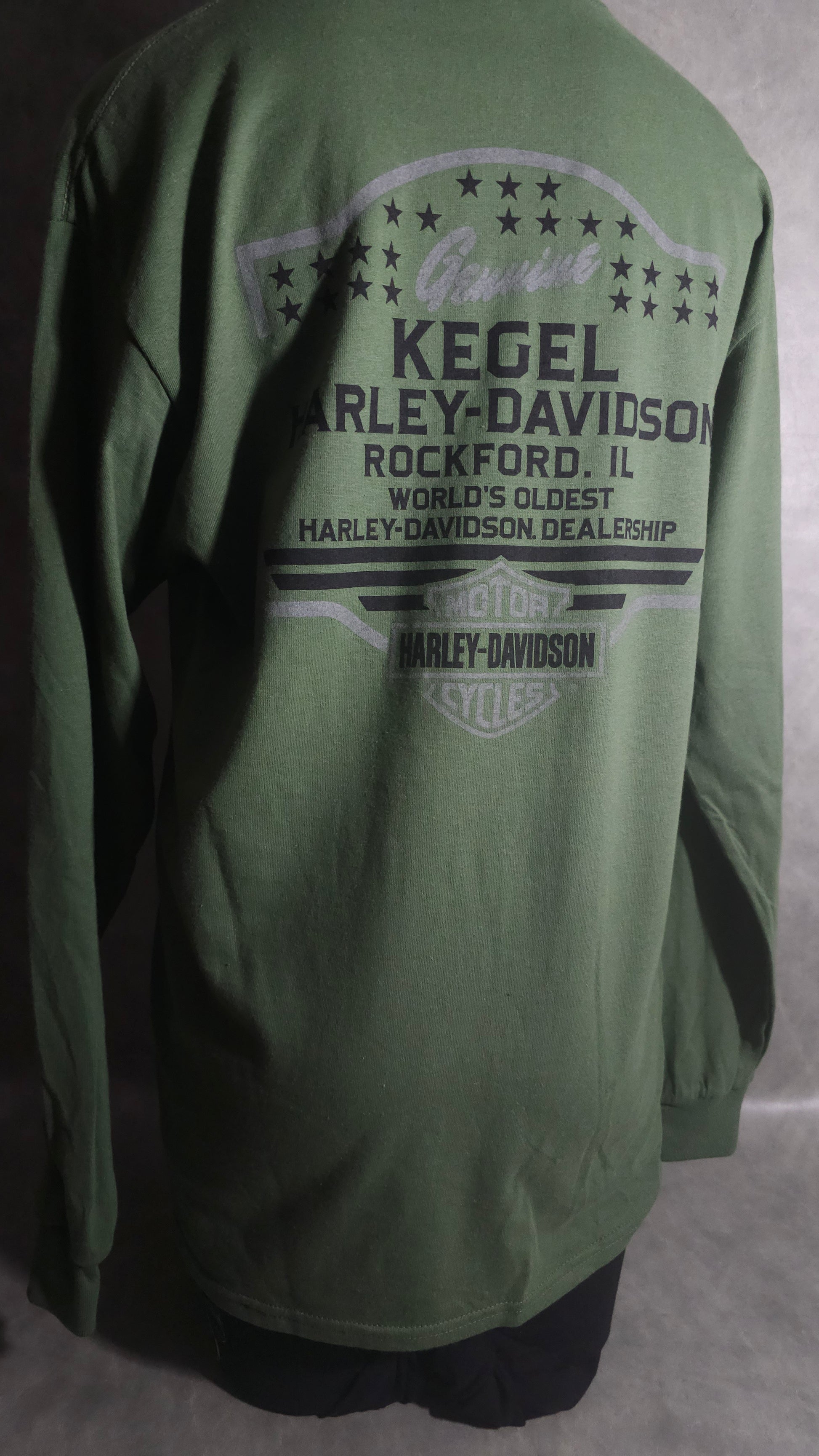 Introducing the Men's Long Sleeve "HD Outburst" tee. Made from 100% cotton, this olive green shirt features bold black lettering on the front that says "Harley Davidson". The dealership name is also proudly displayed on the back. Upgrade your wardrobe with this stylish and comfortable piece today.