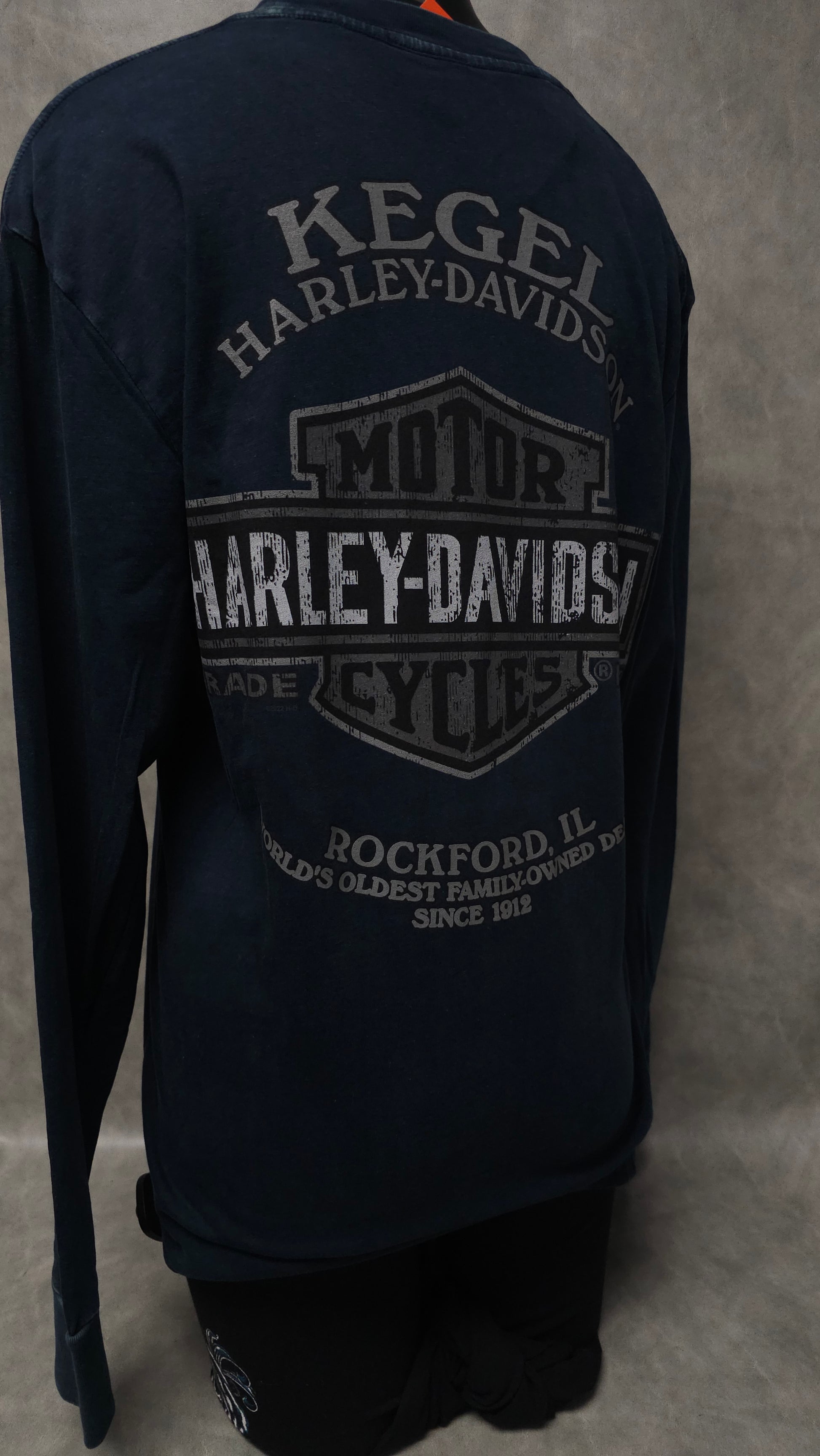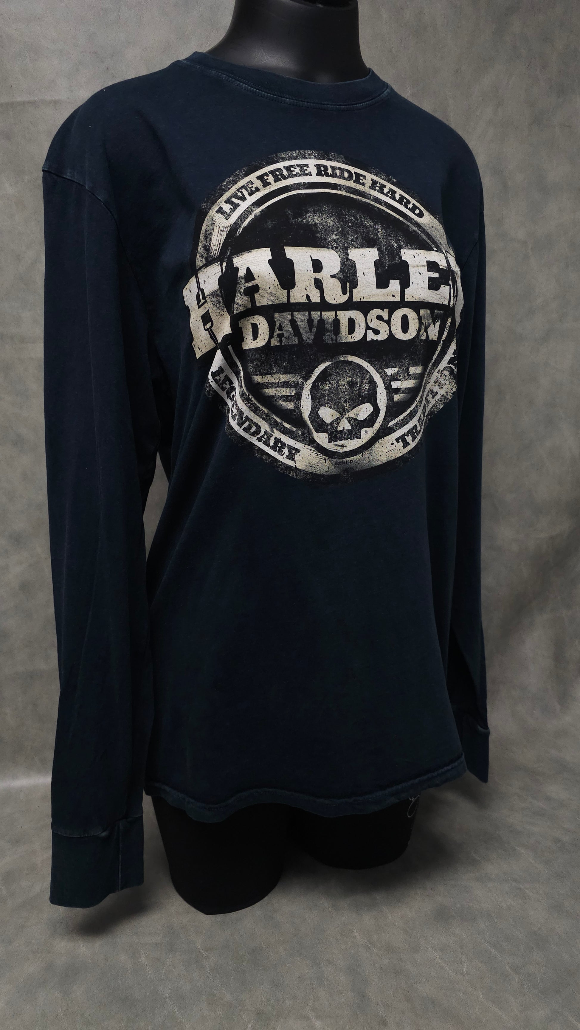 Rev up your style with our distressed-dark-blue Men's Long Sleeve "Oil Grunge" shirt. Featuring the iconic Harley Davidson logo and the rebellious willie g skull, this 100% cotton shirt is a must-have for every biker's wardrobe. Available exclusively at our dealership.