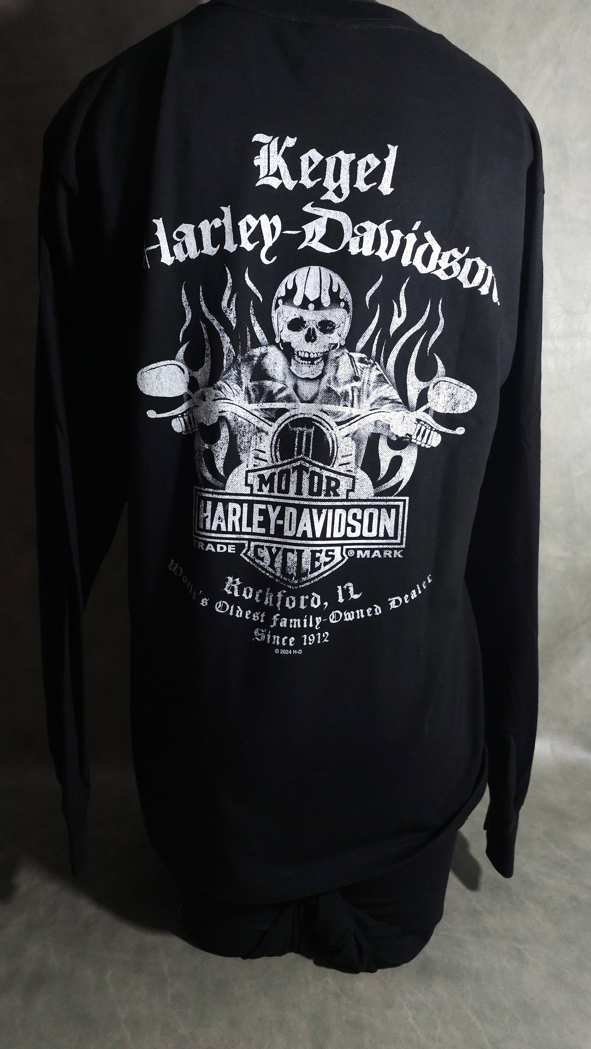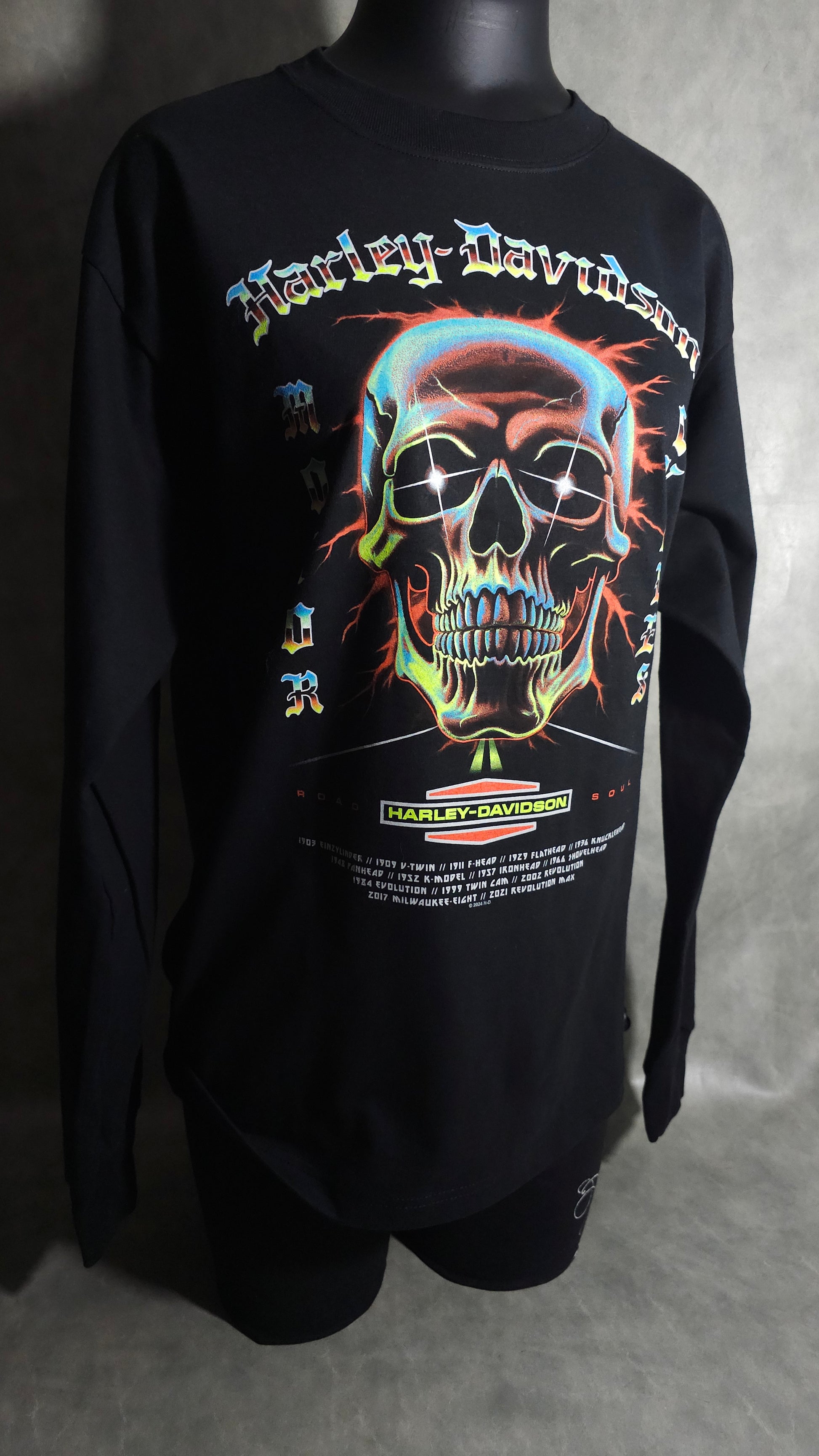 Rev up your style with the men's "Road Soul" long sleeve shirt from Harley Davidson. Made of 100% soft cotton, this sleek black shirt features a vibrant skull on the front and the dealership name on the back. Perfect for any rider who wants to make a bold statement.