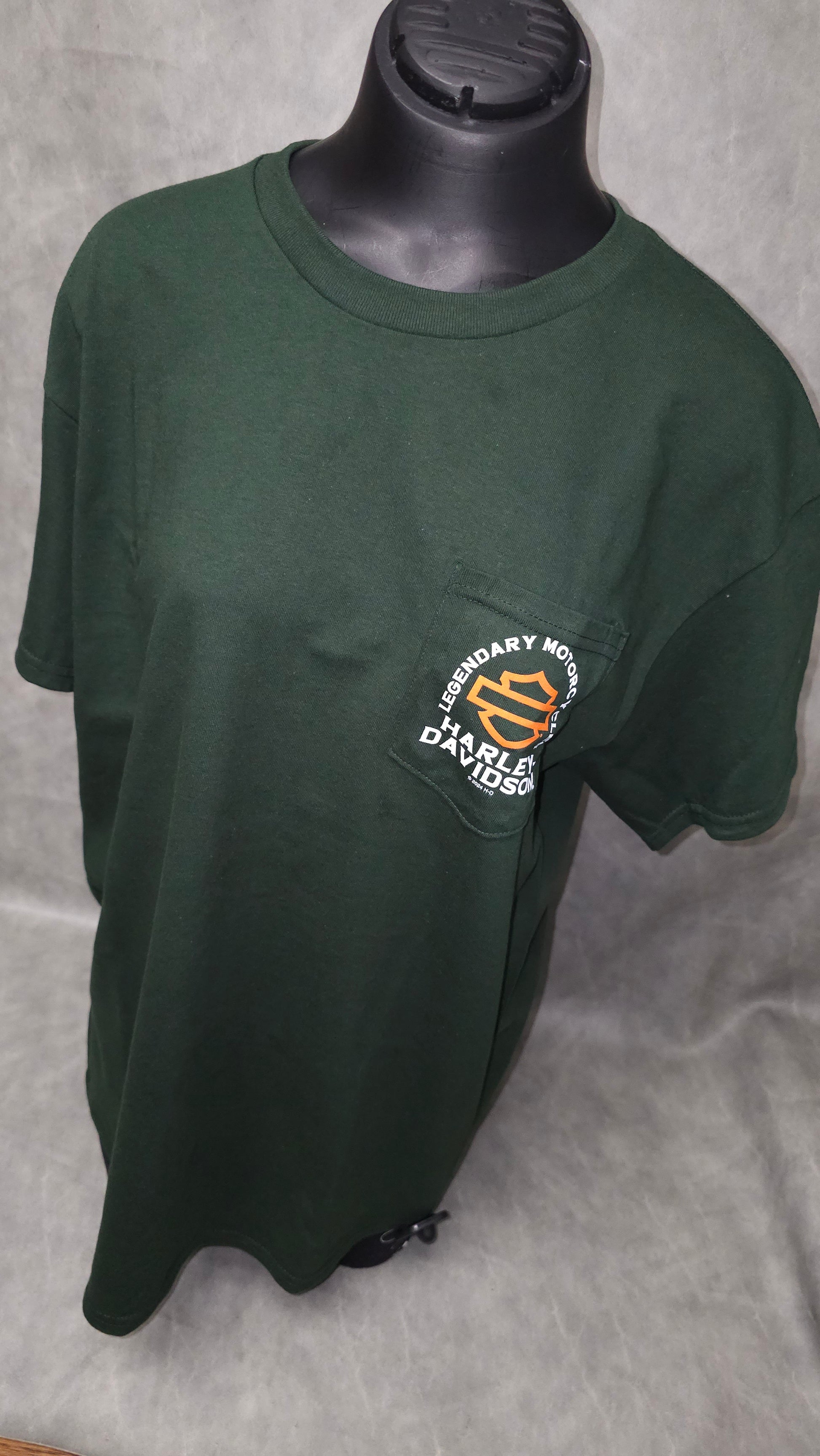 Upgrade your wardrobe with this Men's Short Sleeve "HD Treasures" tee. Made of 100% cotton, this olive green shirt features a stylish pocket with bold white wording and an eye-catching orange bar and shield. Complete with the dealership name on the back, it's the perfect addition to any biker's collection.