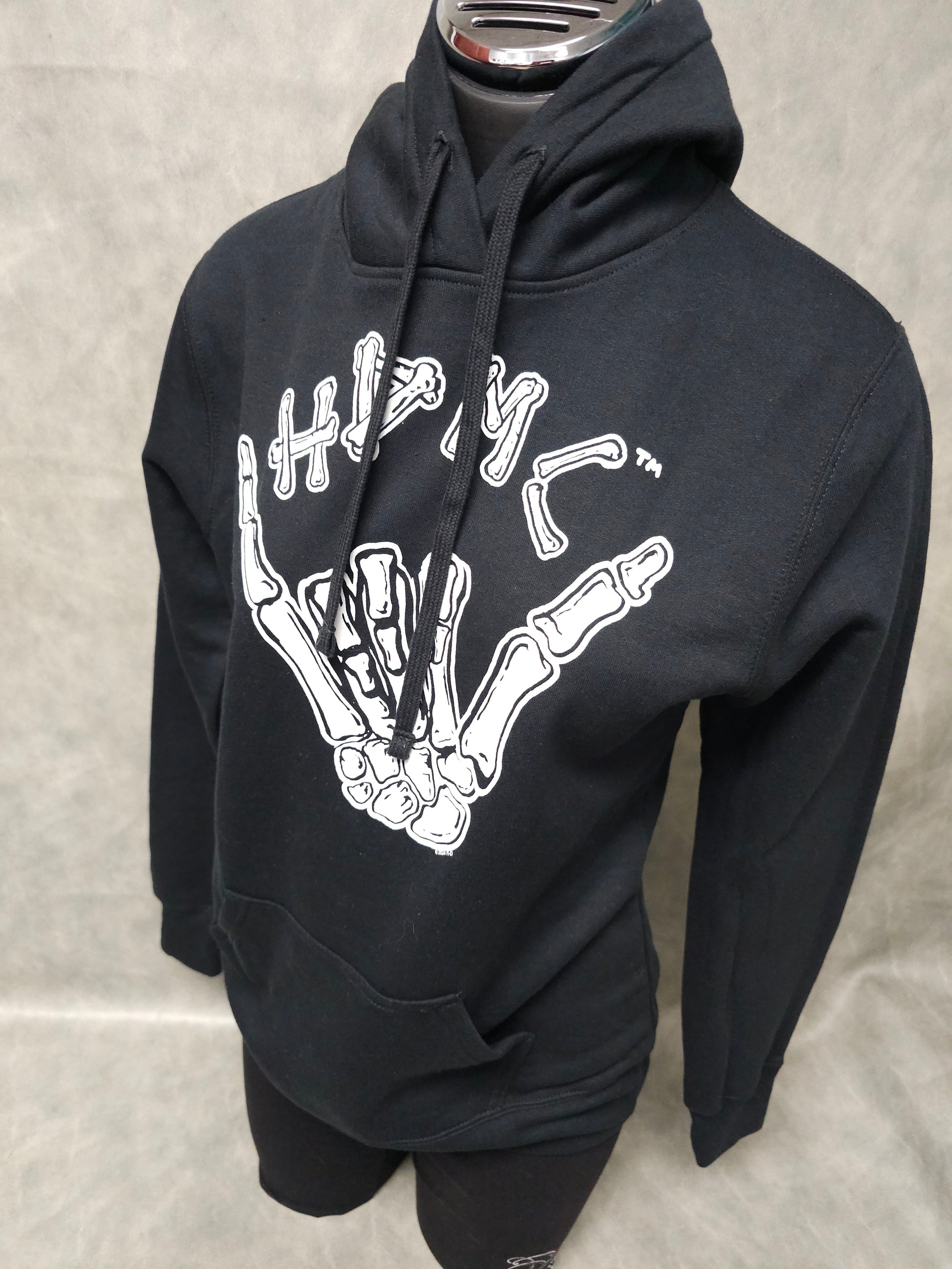 Upgrade your wardrobe with the Women's Black Pullover "HDMC Thrown Bones", featuring a bold skeleton hand design on the front and the dealership name on the back. Stay warm and stylish in this must-have pullover hoodie. 50% COTTON 50% POLYESTER