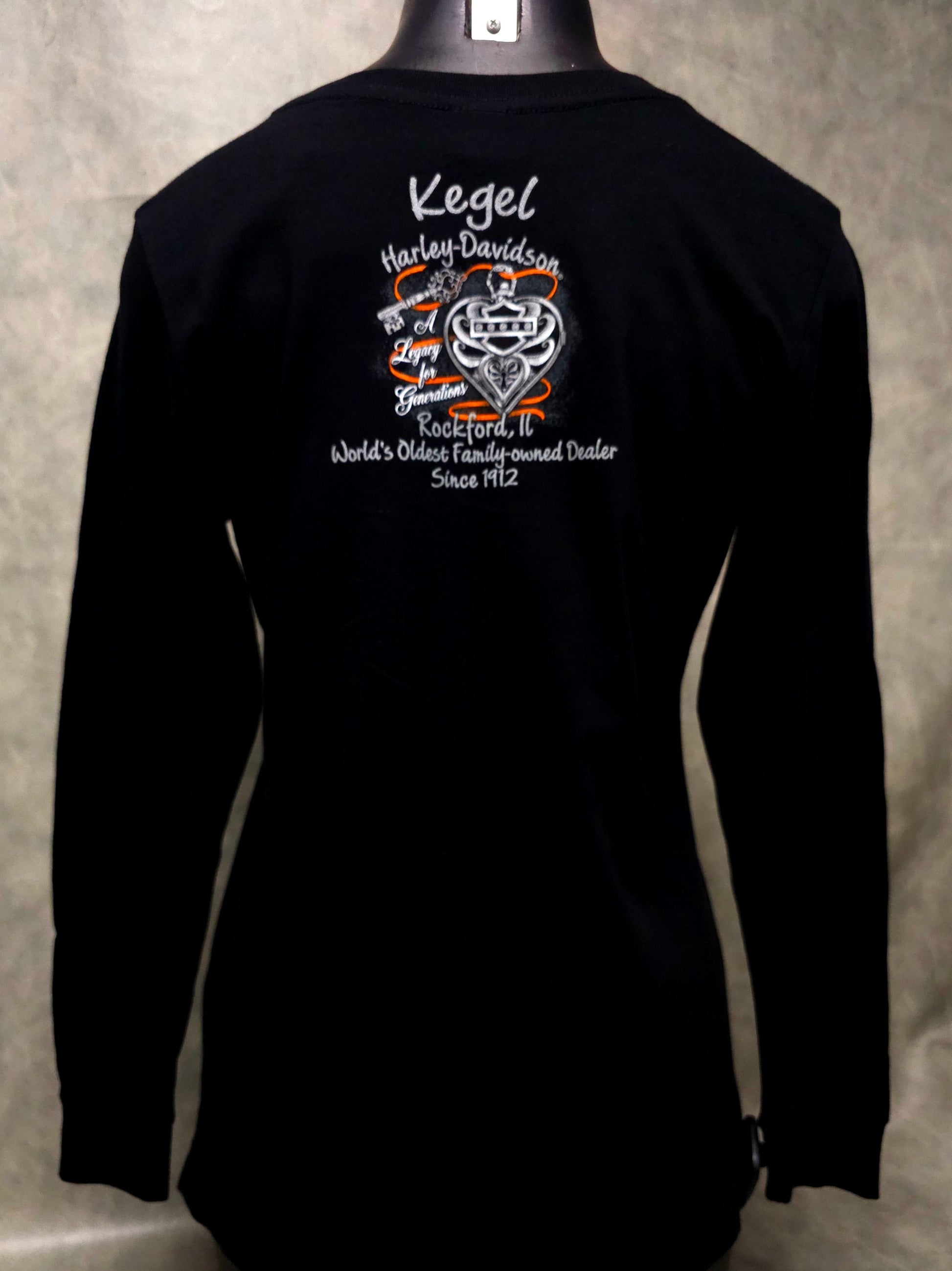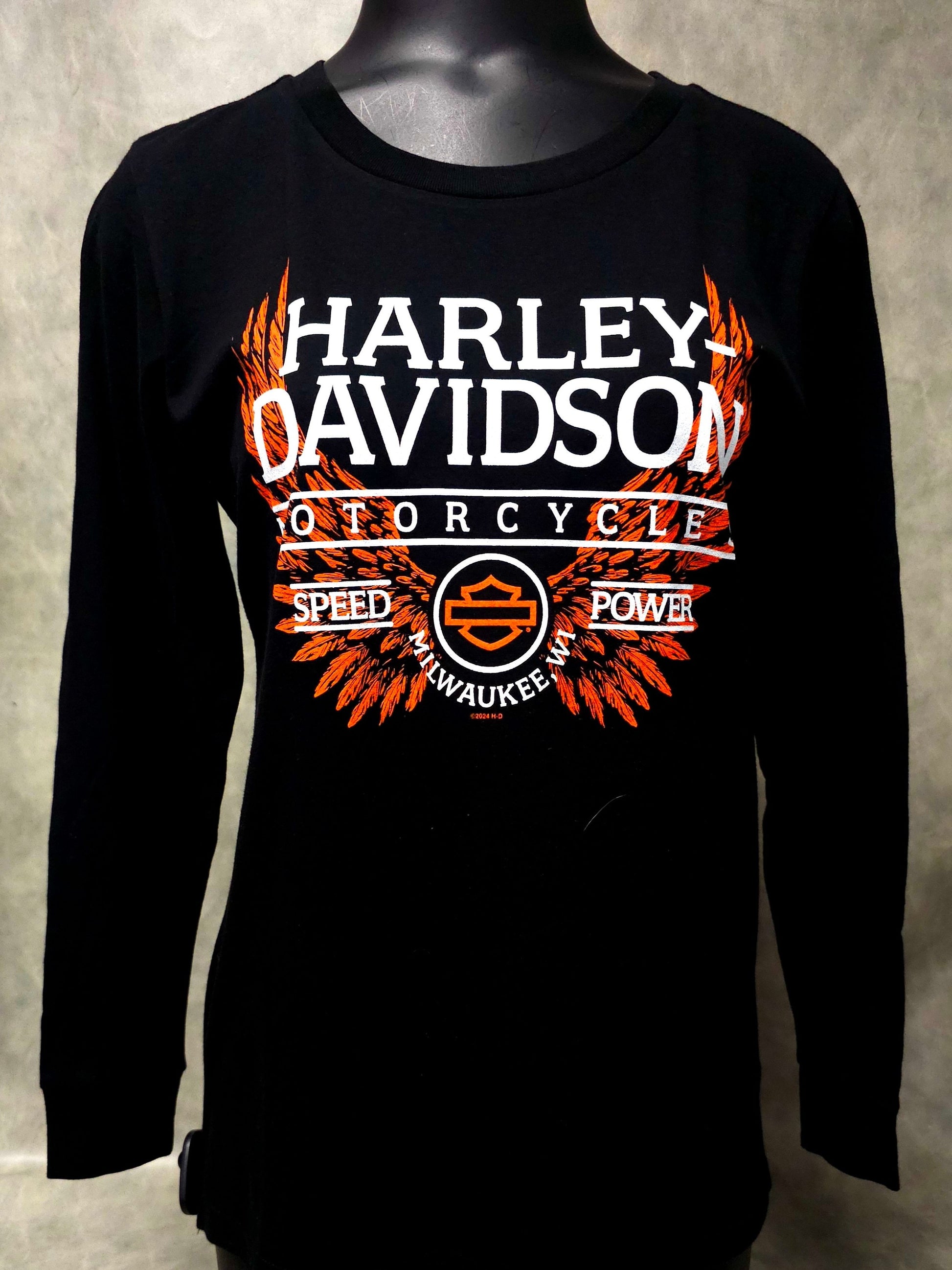 This women's long sleeve is the ultimate statement piece for all Harley Davidson lovers. Made with 100% cotton, this black shirt features the iconic brand's label on the back. Show off your love for the dealership and the brand in style.