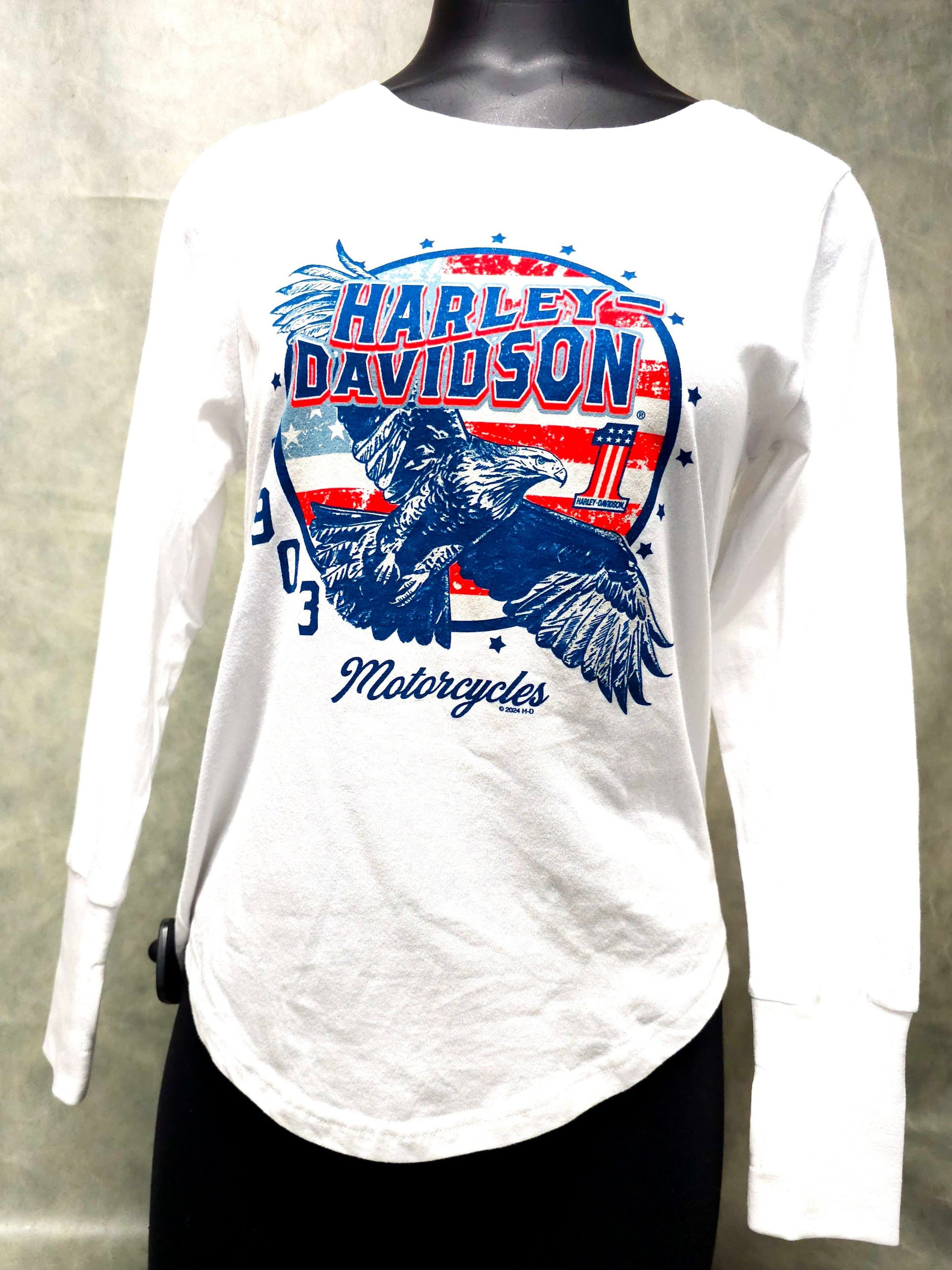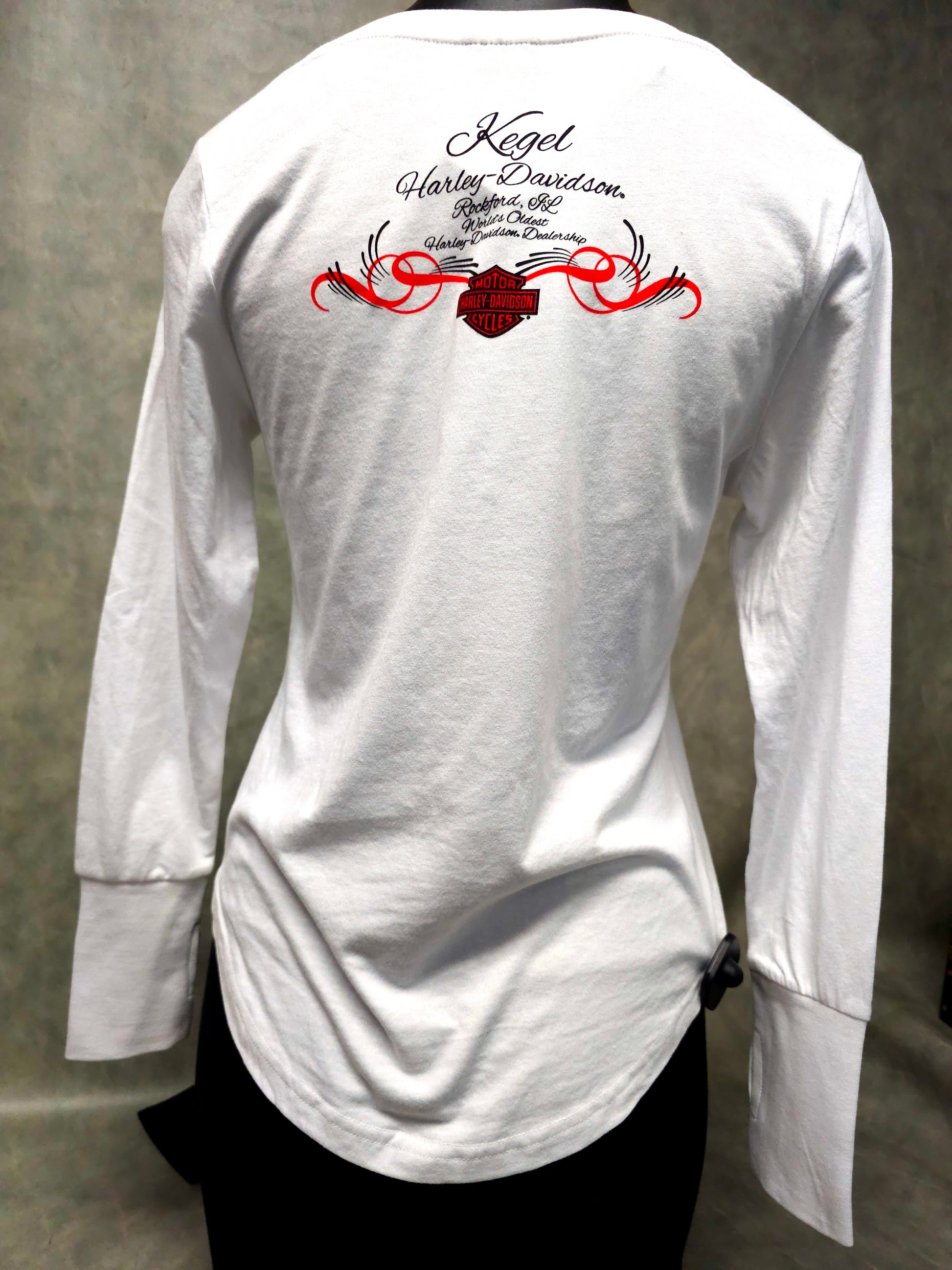 Showcase your love for Harley Davidson with this sleek white long sleeve shirt. The dealership name on the back adds a unique touch to this 60% cotton, 40% polyester shirt. Stay comfortable and stylish while representing your favorite brand.