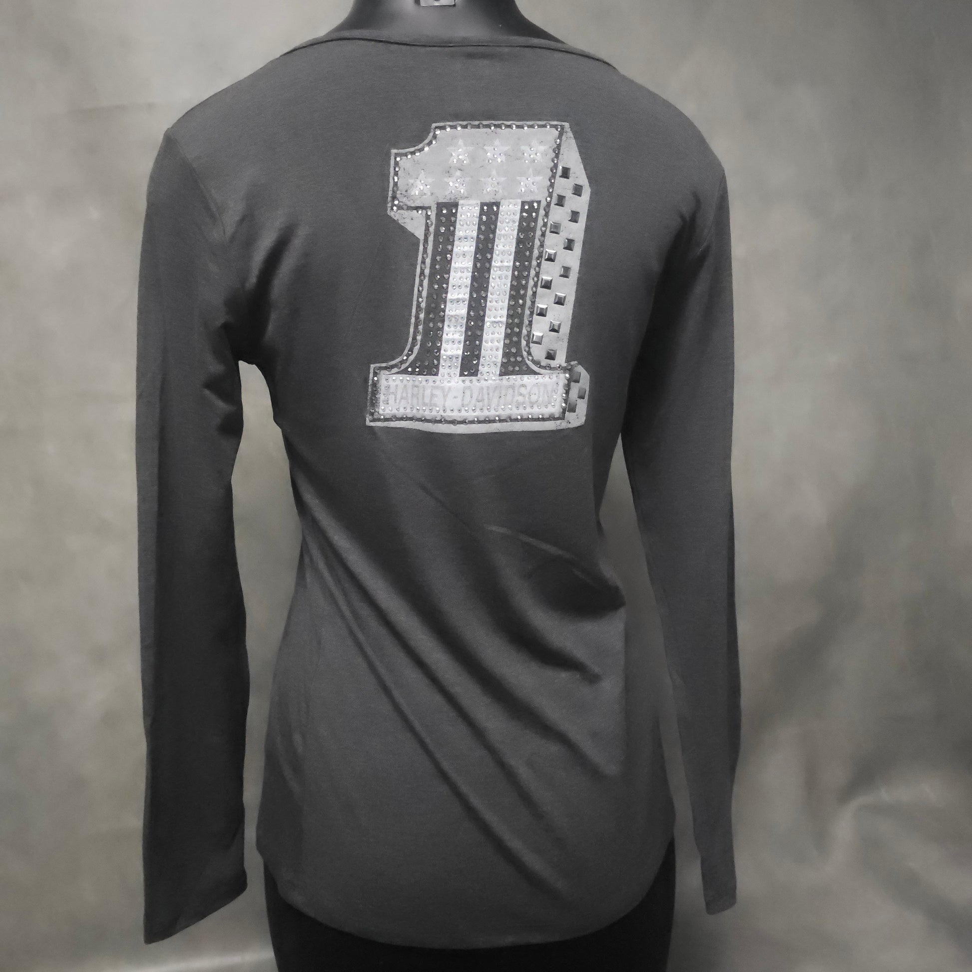 Introducing the "One Stamped" long sleeve shirt for women by Harley Davidson. Made with 95% rayon and 5% spandex, this gray shirt offers comfort and style for your next ride. Get yours today and show off your love for Harley Davidson.