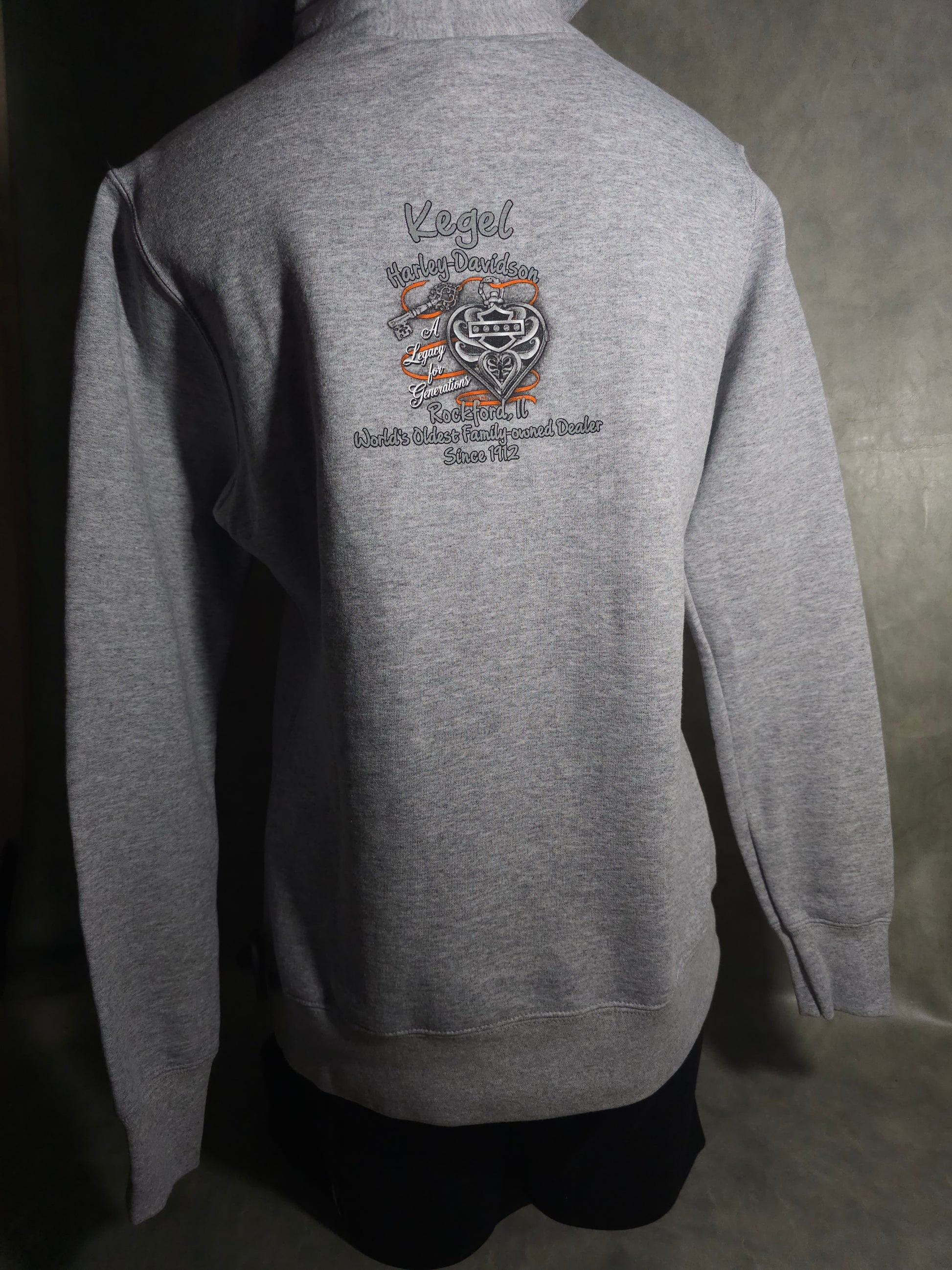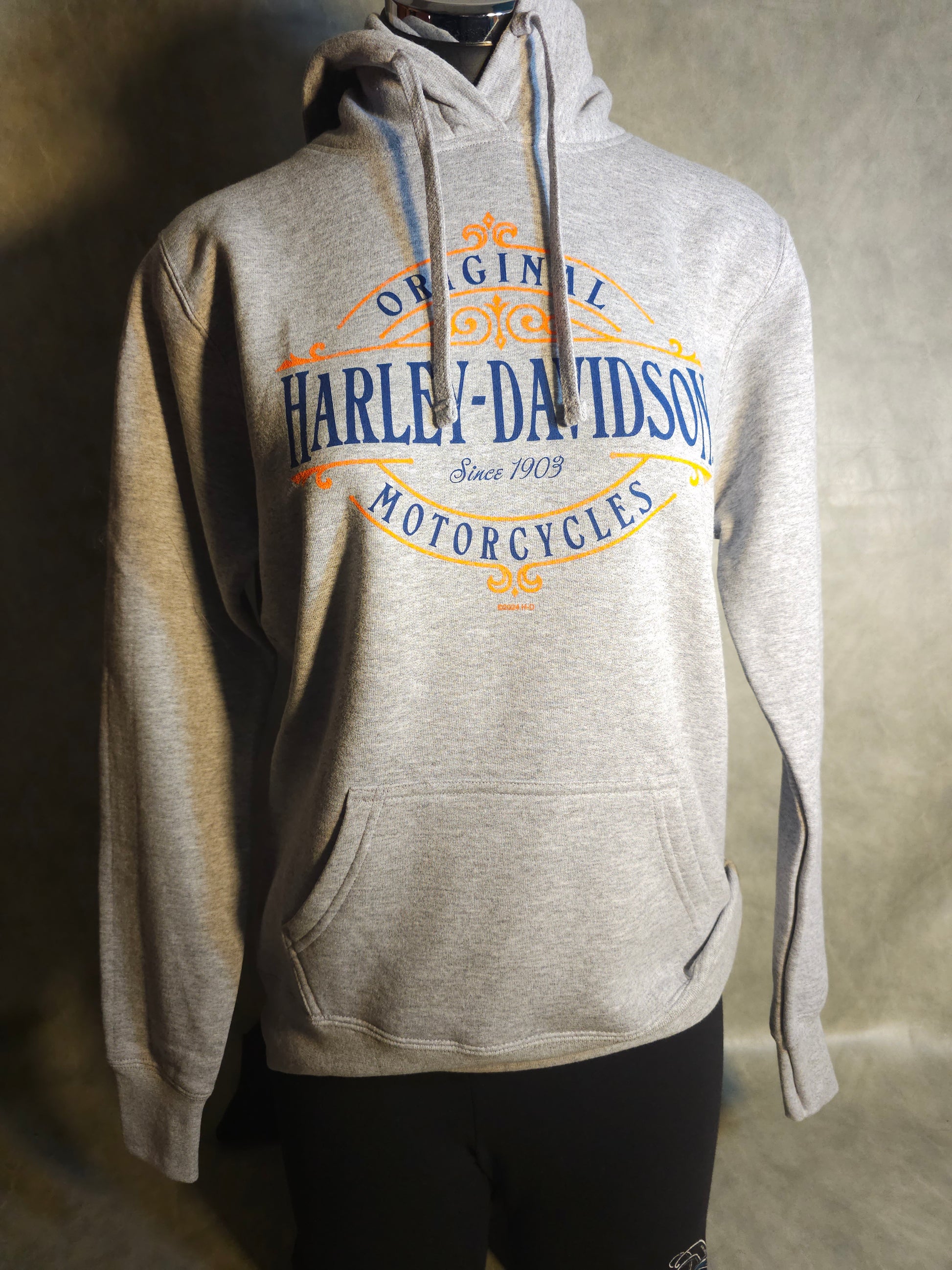 Experience comfort and style with our Women's Pullover "Scroll Arc". Made of soft 50% cotton and 50% polyester, this grey Harley Davidson sweatshirt is perfect for any occasion. With the dealership name on the back, show off your love for your favorite brand. Upgrade your wardrobe today!