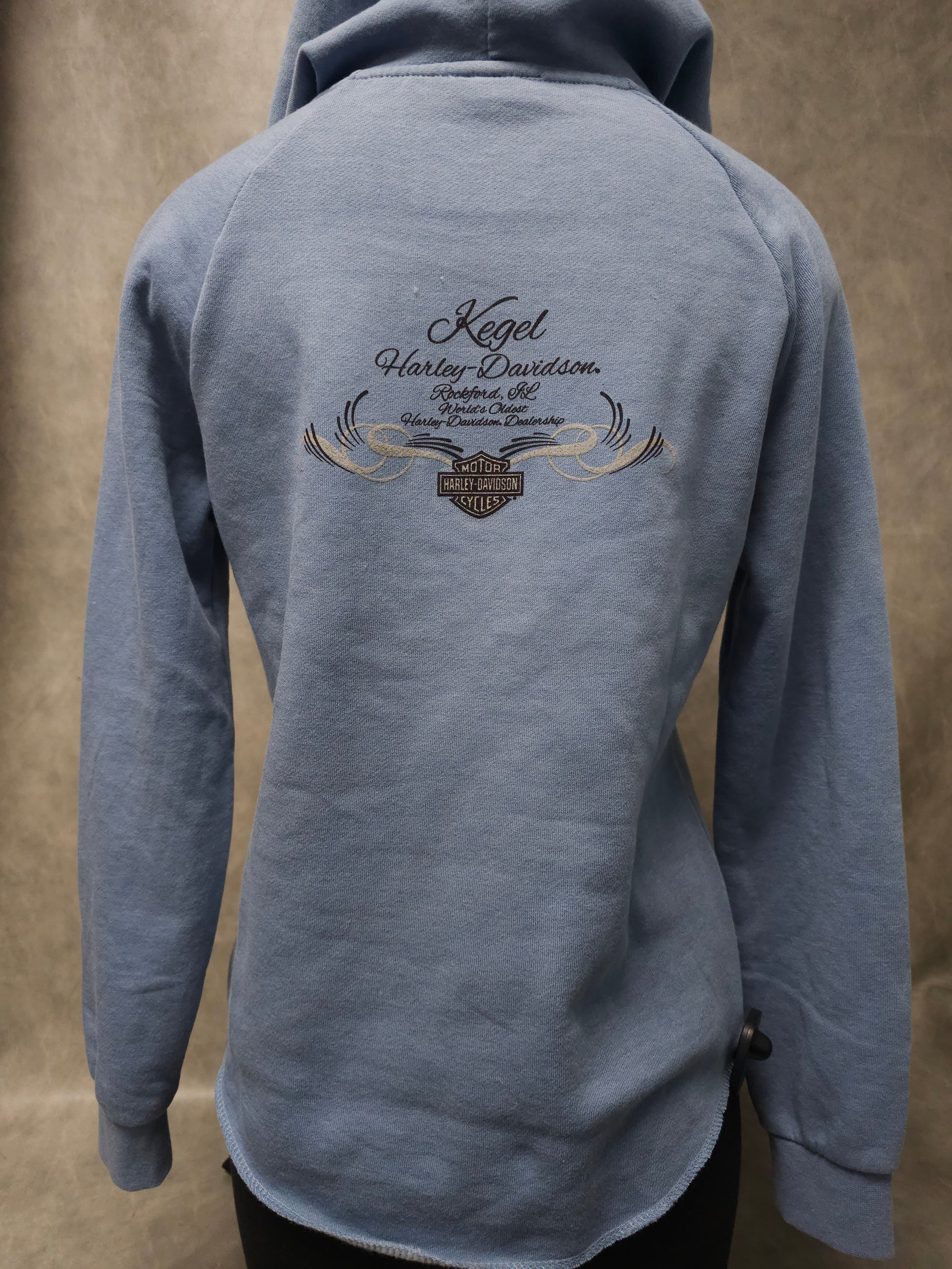 Upgrade your wardrobe with our Women's Zip-Up "HD Misty" jacket. This blue Harley Davidson jacket is a stylish combination of 52% cotton and 48% polyester. With the dealership name proudly displayed on the back, show off your love for the iconic brand while staying comfortable and fashionable.